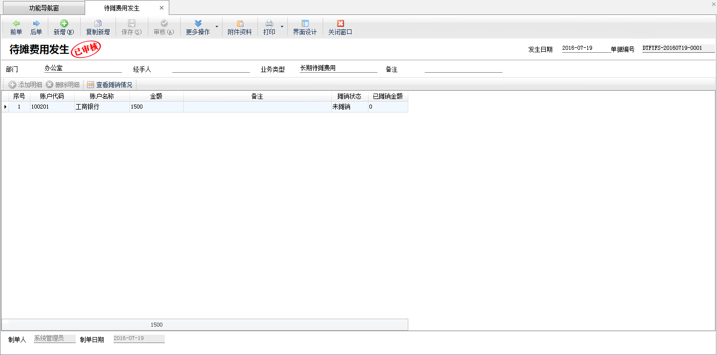 點(diǎn)擊“財務(wù)處理”—》“待攤費(fèi)用”—》“待攤費(fèi)用發(fā)生”,在“待攤費(fèi)用發(fā)生”功能中,錄入付款賬戶和付款金額,如果需要按部門核算也可以選擇相應(yīng)的部門。