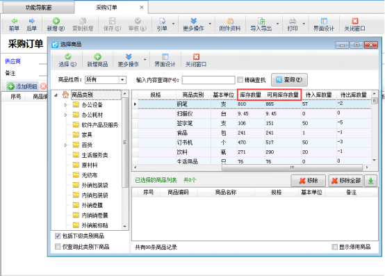 參數(shù)設(shè)置好后,在開單選擇商品明細時就可以查看到商品的庫存數(shù)量,以及可用庫存量。以采購訂單為例,選擇商品明細時,商品界面顯示設(shè)置的參數(shù),如圖2所示: