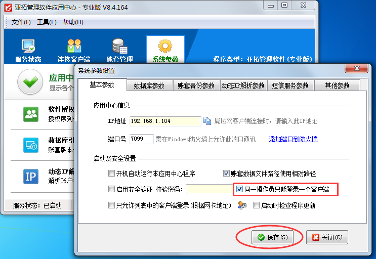 在亞拓管理軟件應用中心內(nèi)點擊“系統(tǒng)參數(shù)”—》“基本參數(shù)”打開“基本參數(shù)”設置界面,在“基本參數(shù)”設置界面打勾啟用“同一操作員只能登錄一個客戶端”,然后點擊“保存”按鈕保存設置,如下圖一所示。