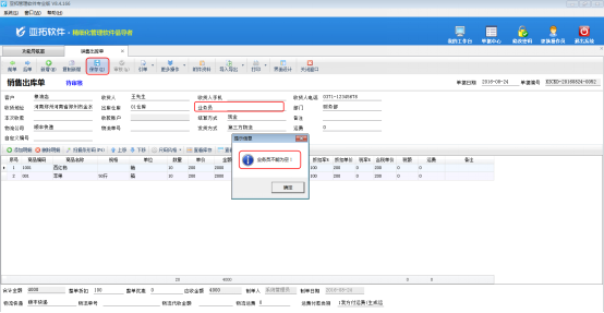 參數(shù)保存后,在功能導(dǎo)航窗點(diǎn)擊“銷(xiāo)售管理”—》“銷(xiāo)售出庫(kù)單”,新增銷(xiāo)售出庫(kù)單,此時(shí)單據(jù)不用填寫(xiě)業(yè)務(wù)員信息就可以保存審核了,如圖3所示。