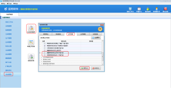 在功能導(dǎo)航窗中點(diǎn)擊“系統(tǒng)管理”—》“系統(tǒng)參數(shù)配置”,即可進(jìn)入“系統(tǒng)參數(shù)設(shè)置”界面,點(diǎn)擊“業(yè)務(wù)參數(shù)”,如圖2所示,在業(yè)務(wù)單據(jù)保存參數(shù)內(nèi)找到“銷(xiāo)售單保存時(shí)業(yè)務(wù)員不能為空”參數(shù),把這個(gè)參數(shù)的勾選去掉,然后保存。