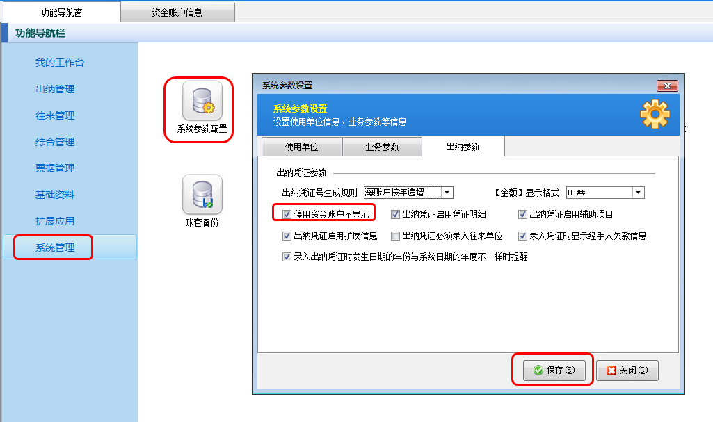 在功能導(dǎo)航窗點(diǎn)擊“系統(tǒng)管理”——》“系統(tǒng)參數(shù)配置”——》“出納參數(shù)”內(nèi)打勾啟用“停用資金賬戶不顯示”參數(shù),然后點(diǎn)擊“保存”按鈕保存配置。