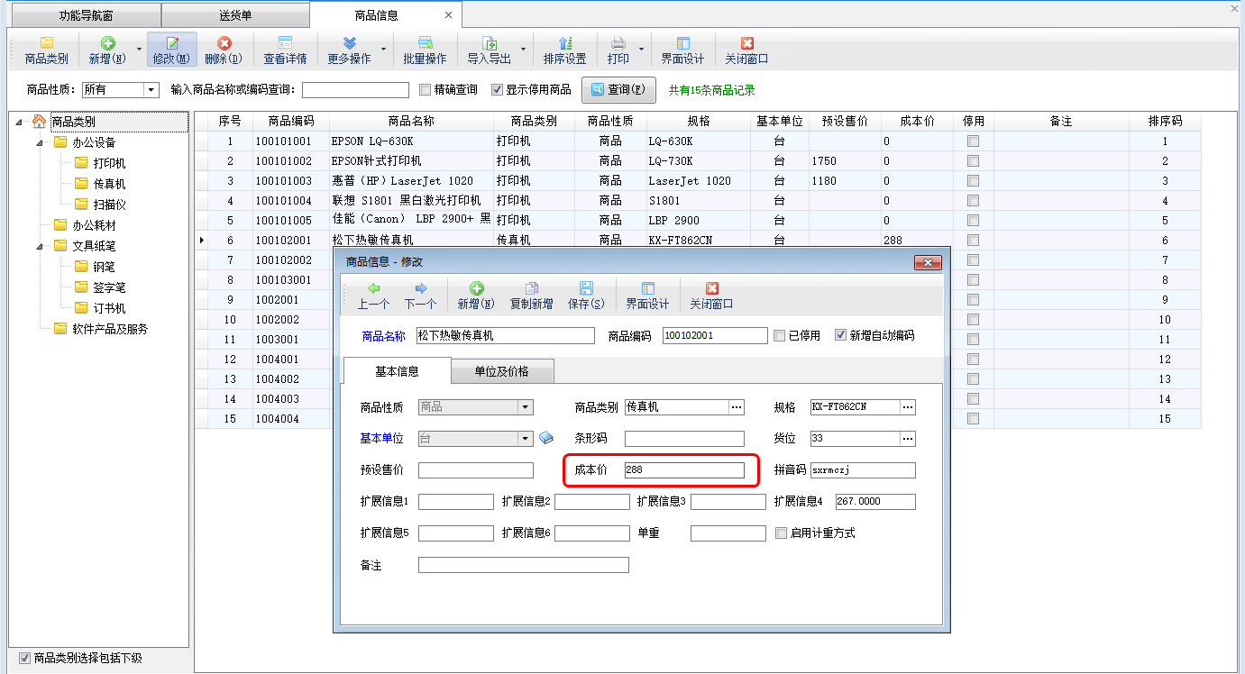 在功能導航窗點擊“基礎資料”—》“商品信息”打開商品信息主界面,修改商品“松下熱敏傳真機”成本價為288元,如下圖一所示。