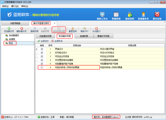 系統(tǒng)管理員登錄軟件后,在功能導(dǎo)航窗點(diǎn)擊“系統(tǒng)管理”——》“操作員及授權(quán)”即可打開“操作員管理及授權(quán)”界面,以操作員“張亞”為例,選中操作員“張亞”后,點(diǎn)擊“其他操作權(quán)限”,去掉勾選“可修改其他人員所開的票據(jù)”參數(shù),然后點(diǎn)擊“保存權(quán)限設(shè)置”按鈕,如圖1所示。