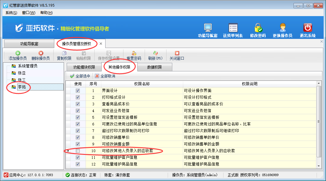 紅管家送貨單打印軟件內(nèi)支持設(shè)置操作員不可修改其他人員所錄入的應(yīng)收款,下面我們?cè)敿?xì)介紹一下送貨單軟件內(nèi)如何設(shè)置操作員不可修改其他人員所錄入的應(yīng)收款?