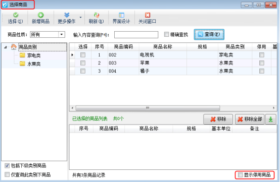 設(shè)置完成之后,新開一個(gè)單據(jù),添加商品明細(xì)進(jìn)行選擇商品時(shí),“選擇商品”窗口默認(rèn)不顯示已停用的商品,如圖2所示。