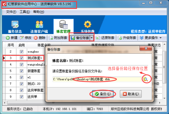 送貨單單機版更換電腦需要首先把原來的電腦做好備份工作,備份是在電腦的應(yīng)用中心(紅色圖標(biāo))上進行操作。備份時可以選擇備份的保存路徑,為了更清晰的看到備份數(shù)據(jù)方便拷貝,可以把備份路徑更改為桌面。具體操作如下圖1所示: