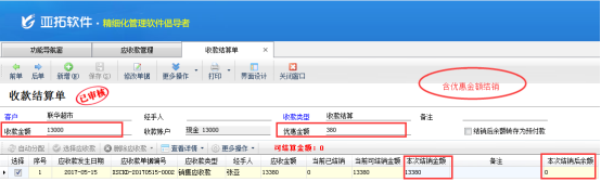 客戶(hù)結(jié)銷(xiāo)存在優(yōu)惠金額,例如下圖應(yīng)收款金額為13380元,優(yōu)惠了380元,實(shí)付款13000元。在收款結(jié)算時(shí),本次結(jié)銷(xiāo)金額依舊填寫(xiě)“13380”收款金額填寫(xiě)“13000”優(yōu)惠金額輸入“380”,然后點(diǎn)擊“保存”應(yīng)收款結(jié)算完成。如下圖4所示: