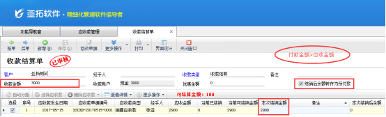 客戶(hù)本次結(jié)銷(xiāo)金額大于其應(yīng)收金額,可以在結(jié)銷(xiāo)應(yīng)收款的時(shí)候,把多余的應(yīng)收款轉(zhuǎn)存為客戶(hù)預(yù)付款,可以在下次結(jié)銷(xiāo)應(yīng)收款時(shí)進(jìn)行抵消應(yīng)收款。例如下圖,客戶(hù)本次收款金額為2900元,實(shí)付款3000元。在“收款結(jié)算單”界面,本次結(jié)銷(xiāo)金額正常填寫(xiě)當(dāng)前可結(jié)銷(xiāo)金額2900元,收款金額填寫(xiě)“3000元”,勾選上“結(jié)銷(xiāo)后余額轉(zhuǎn)存為預(yù)付款”,則結(jié)銷(xiāo)完成,在應(yīng)收款管理界面會(huì)增加一個(gè)“客戶(hù)預(yù)付款”單據(jù),如下圖5、圖6所示: