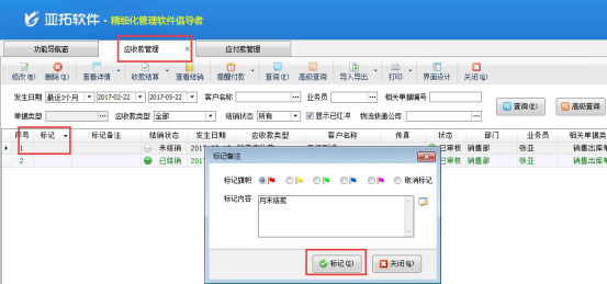 亞拓管理軟件和紅管家倉(cāng)庫(kù)管理軟件都可以對(duì)應(yīng)收款管理、應(yīng)付款管理進(jìn)行標(biāo)記備注。送貨單軟件的應(yīng)收款管理中也可以對(duì)應(yīng)收款進(jìn)行標(biāo)記備注。下面我們以亞拓管理軟件專業(yè)版為例,介紹對(duì)應(yīng)收款管理標(biāo)記備注的操作步驟(應(yīng)付款和應(yīng)收款操作一致)。