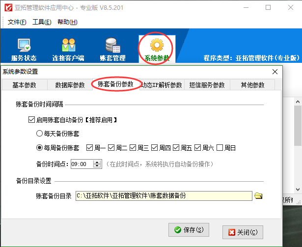 亞拓管理軟件紅管家送貨單軟件紅管家出納記賬軟件紅管家倉庫管理軟件紅管家票據軟件都支持設置賬套自動備份,我們強烈建議啟用自動備份功能,以便賬套出現問題的時候從賬套備份文件中恢復數據。本節我們以亞拓管理軟件為例詳細介紹一下如何啟用賬套自動備份功能?