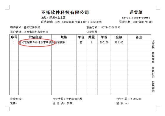 以送貨單軟件為例,示范下如何設(shè)置打印模板中文本框?yàn)樽詣?dòng)折行。先新增一個(gè)送貨單,商品名稱為“亞拓標(biāo)準(zhǔn)版本單機(jī)版”正常開單后確認(rèn)開單,預(yù)覽之前的模板,商品名稱過(guò)長(zhǎng)顯示不全,如下圖1所示: