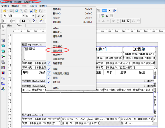 在送貨單界面選擇“打印”—》“打印格式設(shè)計(jì)”進(jìn)入打印格式設(shè)計(jì)界面,如當(dāng)前模板為默認(rèn)模板則直接在工具欄點(diǎn)擊“設(shè)計(jì)格式”,不是默認(rèn)模板,需要先點(diǎn)擊下模板進(jìn)行選定模板后打開工具欄的“設(shè)計(jì)格式”,進(jìn)入打印模板設(shè)計(jì)器界面,選擇需要折行的文本框,點(diǎn)擊鼠標(biāo)右鍵,彈出一個(gè)界面,對(duì)“自動(dòng)折行”項(xiàng)進(jìn)行勾選,然后保存模板即可。如下圖2所示: