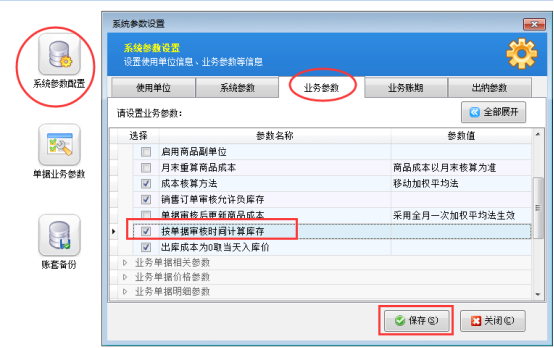 按照單據審核時間管理庫存設置如下,首先需要在系統管理—》系統參數配置—》業(yè)務參數中啟用下參數,如下圖1所示: