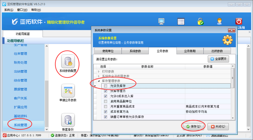在功能導(dǎo)航窗點擊“系統(tǒng)管理”—》“系統(tǒng)參數(shù)配置”—》“業(yè)務(wù)參數(shù)”,即可進入到“業(yè)務(wù)參數(shù)”配置界面,在庫存管理參數(shù)內(nèi)找到“允許負庫存”參數(shù),把這個參數(shù)的勾選去掉,然后保存,如下圖一所示。