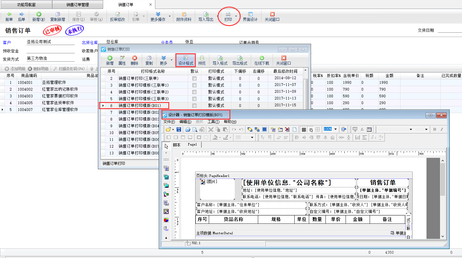 以亞拓管理軟件專業(yè)版為例,打開一個(gè)已開的銷售訂單單據(jù),選擇“打印”按鈕下的“打印格式設(shè)計(jì)”,進(jìn)入打印格式設(shè)計(jì)界面,選擇需要調(diào)整的打印格式模版,然后點(diǎn)擊“設(shè)計(jì)格式”按鈕進(jìn)入模板設(shè)計(jì)器界面,如下圖二所示: