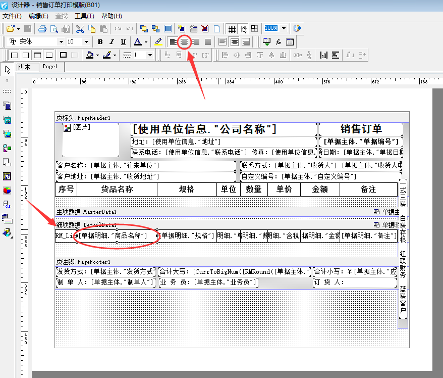 以設(shè)置“貨品名稱”內(nèi)容居中顯示為例,在模版設(shè)計(jì)器界面,選擇“貨品名稱”文本框?qū)?yīng)的細(xì)項(xiàng)數(shù)據(jù)欄目中的文本框,然后在工具欄中點(diǎn)擊“中間對齊”按鈕,設(shè)置完成后保存打印格式模版(如下圖三所示),則“貨品名稱”文本框內(nèi)容即可居中顯示,如下圖四所示。