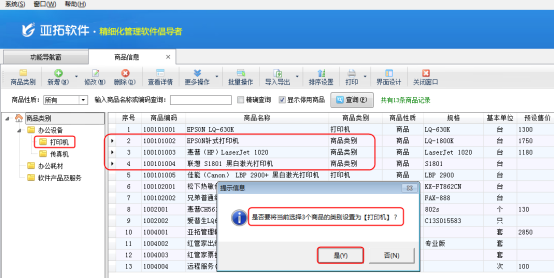 以圖1為例,商品類別是“商品類別”的一共有3條記錄,現(xiàn)在要把這3條記錄的商品類別改為“打印機”。首先點擊第2行記錄,然后按下Shift鍵不松手時鼠標(biāo)點擊第4行記錄,這樣就可以同時快速選中第2行至第4行這3條記錄,選中多條記錄后,再按住鼠標(biāo)左鍵不松手,移動到商品類別“打印機”處,此時系統(tǒng)會提示“是否要將當(dāng)前選擇3個商品的類別設(shè)置為【打印機】?”,點“是”按鈕即可,如圖2所示。