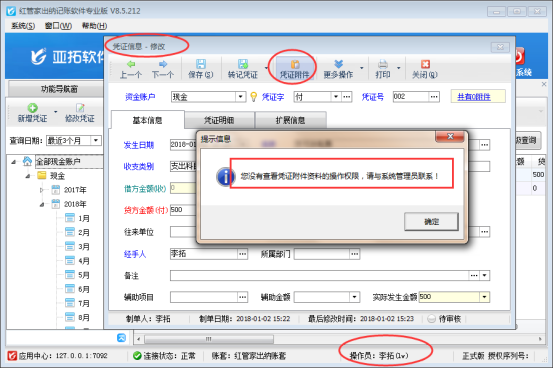 紅管家出納記賬軟件、亞拓管理軟件標準版、專業版支持日記賬導入憑證附件資料,更清晰的管理每筆日記賬的票據詳情信息。為避免每個人都查看到日記賬的詳細開票信息,軟件支持控制操作員的可查看憑證附件資料權限。