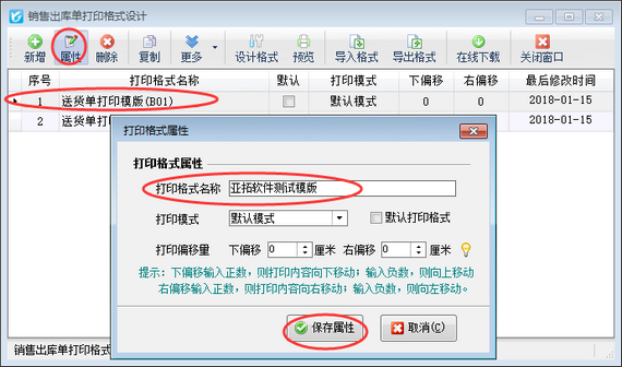 以亞拓管理軟件為例,示范一下如何修改打印格式模版名稱,打開一個已保存的銷售出庫單,在工具欄點擊“打印”—》“打印格式設計”(圖一)打開“銷售出庫單打印格式設計”窗口(圖二),選擇“送貨單打印模版(B01)”,然后在工具欄點擊“屬性”按鈕,在打開的“打印格式屬性”窗口即可修改打印模版名稱(圖三)。