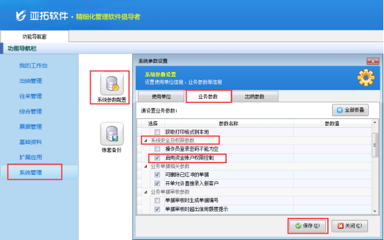 在功能導航窗選擇“系統(tǒng)管理”—》“系統(tǒng)參數(shù)配置”—》“業(yè)務(wù)參數(shù)”進入業(yè)務(wù)參數(shù)配置界面,在系統(tǒng)安全及權(quán)限參數(shù)中勾選“啟用資金賬戶權(quán)限”參數(shù),如下圖1所示: