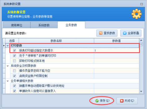 以信管飛送貨單軟件為例,示范下如何設置操作員不能超過指定的打印次數(shù)權限。首先,設置下系統(tǒng)報表打印次數(shù)提示,在功能導航窗點擊“系統(tǒng)管理”—》“系統(tǒng)參數(shù)配置”—》“業(yè)務參數(shù)”,在業(yè)務參數(shù)中將“報表打印超過指定次數(shù)提示”勾選上,并設置打印次數(shù),系統(tǒng)默認打印次數(shù)為1,可根據(jù)自己實際需求設置。設置完成后點擊保存,如下圖1所示: