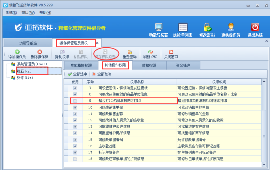 在功能導航窗點擊“系統(tǒng)管理”—》“操作員及授權”進入操作員管理及授權界面,選擇操作員“張亞”(系統(tǒng)管理員默認具有所有權限),在右側功能權限選擇“其他操作權限”,把此界面下的權限“超過打印次數(shù)限制仍可打印”取消勾選,保存權限設置,如下圖2所示: