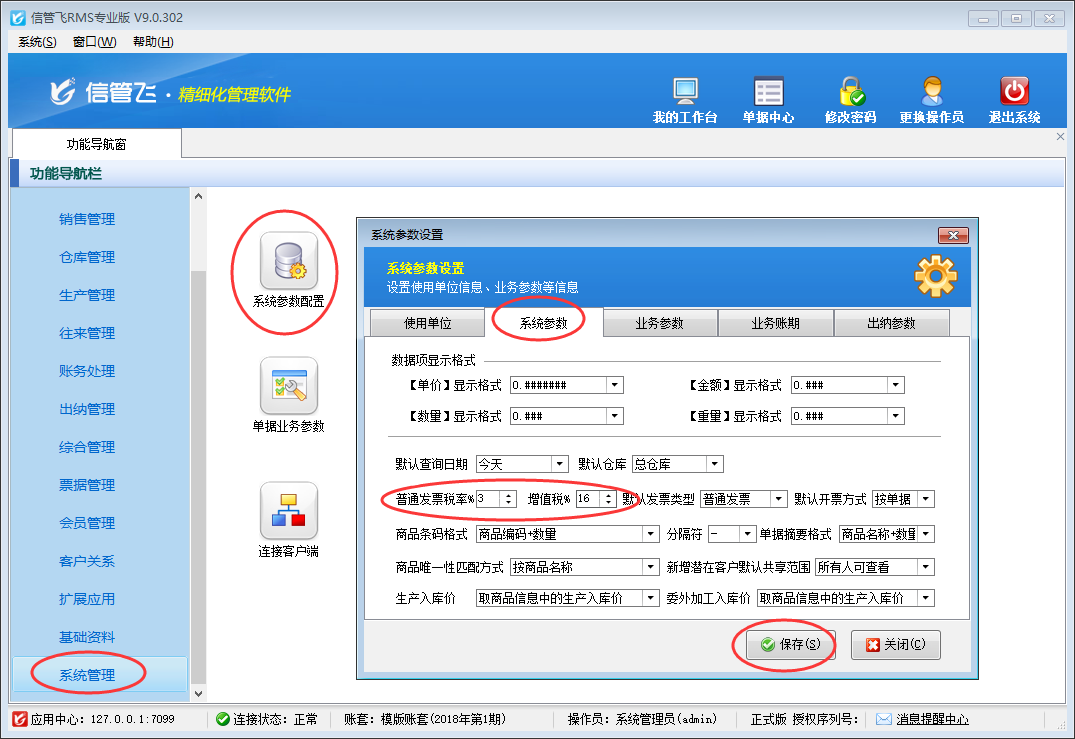 在功能導(dǎo)航窗點(diǎn)擊“系統(tǒng)管理”—》“系統(tǒng)參數(shù)設(shè)置”打開系統(tǒng)參數(shù)設(shè)置界面,在“系統(tǒng)參數(shù)”標(biāo)簽頁可以修改“普通發(fā)票稅率”以及“增值稅專用發(fā)票稅率”,如下圖所示。