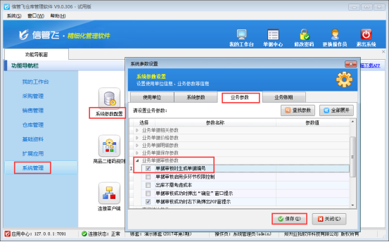 以信管飛倉(cāng)庫(kù)管理軟件為例,示范下如何設(shè)置審核時(shí)生成單據(jù)編號(hào)。在功能導(dǎo)航窗選擇“系統(tǒng)管理”—》“系統(tǒng)參數(shù)配置”—》“業(yè)務(wù)參數(shù)”,即進(jìn)入到業(yè)務(wù)參數(shù)配置界面,在“業(yè)務(wù)參數(shù)審核參數(shù)”中勾選啟用“單據(jù)審核時(shí)生成單據(jù)編號(hào)”參數(shù),保存設(shè)置,如下圖1所示: