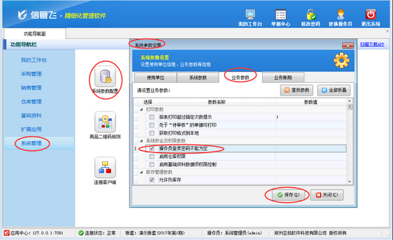 在功能導航窗點擊“系統管理”→“系統參數設置”→“業(yè)務參數”可以打開“業(yè)務參數”配置界面,在系統安全及權限參數內打鉤啟用“操作員登陸密碼不能為空”參數,然后點擊“保存”按鈕保存設置,如下圖一所示。