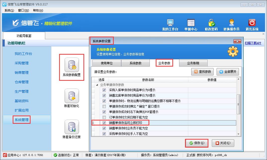 在功能導航窗點擊“系統管理”——》“系統參數配置”打開系統參數配置界面,在業務單據保存參數中打勾選中“銷售單保存后可立即打印”參數,然后點擊“保存”按鈕保存設置即可,如下圖所示。