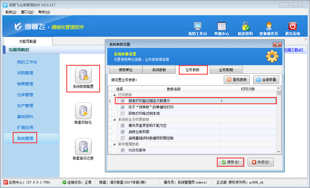 在業務參數界面將打印參數內“報表打印超過指定次數提示”勾選上,并將打印次數設置一下,軟件中默認的打印次數是1,可以根據自己的實際需求進行設置,最后進行保存。