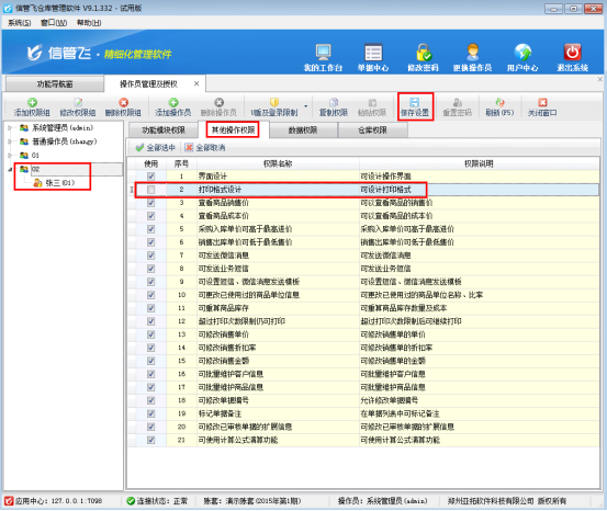 以信管飛倉庫管理軟件為例,介紹一下如何控制操作員的打印模板設(shè)計權(quán)限。在功能導航窗,選擇“系統(tǒng)管理”—》“操作員及授權(quán)”,選擇操作員“張三”,然后在“其他操作權(quán)限”中把“打印格式設(shè)計”權(quán)限前的勾選符號取消,然后點擊“保存設(shè)置”,如下圖1所示:
