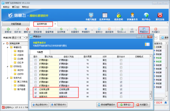參數(shù)配置完成后,打開(kāi)“業(yè)務(wù)處理”—》“送貨單列表”界面,在界面設(shè)計(jì)中把數(shù)據(jù)項(xiàng)“已結(jié)算金額、結(jié)算余額、結(jié)算狀態(tài)”勾選顯示,保存界面設(shè)計(jì),如下圖所示: