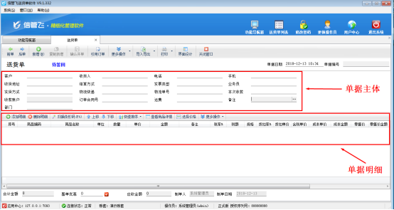 信管飛送貨單軟件業(yè)務單據(jù)的界面分為單據(jù)主體及單據(jù)明細兩部分,如圖1所示,單據(jù)默認值功能是對單據(jù)主體的部分數(shù)據(jù)項進行設(shè)置默認值,業(yè)務單據(jù)設(shè)置默認值后,每次新增單據(jù)時會顯示已設(shè)置的數(shù)據(jù)項默認值。