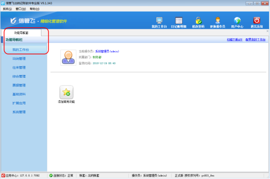 亞拓軟件開發的信管飛出納記賬軟件信管飛RMS信管飛倉庫管理軟件信管飛票據打印軟件等都包含我的工作臺功能,我的工作臺中可以查看當前操作員信息,并且可以添加一些常用的功能模塊。下面我們以信管飛出納記賬軟件專業版為例詳細介紹下我的工作臺功能是如何使用的。