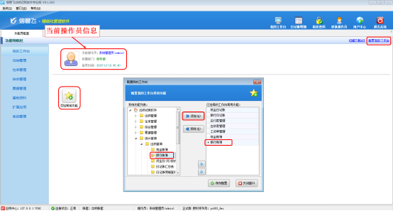 在我的工作臺界面,首先可以查看當前操作員信息,另外點擊“添加常用功能”按鈕可以添加當前操作員有權限的常用功能(點擊右上角“配置我的工作臺”也可以配置我的工作臺常用功能)。