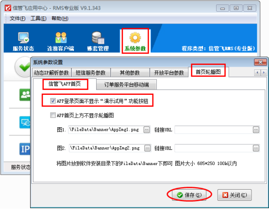 打開應用中心窗口,點“系統參數”—》“首頁輪播圖”—》“信管飛APP首頁”,勾選“APP登錄頁面不顯示“演示試用”功能按鈕”,然后保存設置。如下圖所示:
