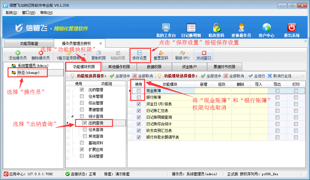 登錄軟件,在功能導航窗點擊“系統管理”—》“操作員及授權”,進入“操作員管理及授權”界面,選擇操作員“張亞”,在其右側的功能模塊權限內選擇“出納查詢”模塊,將現金賬簿和銀行賬簿的“使用”權限勾選取消,然后保存設置,如下圖所示。