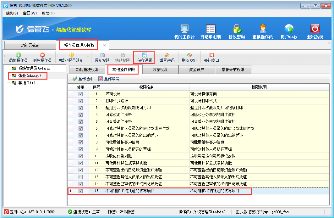 注意:設置操作員不可維護出納憑證的核算項目權限為V9.1.369版本增加的功能,如需要使用此功能,需升級到最新版。