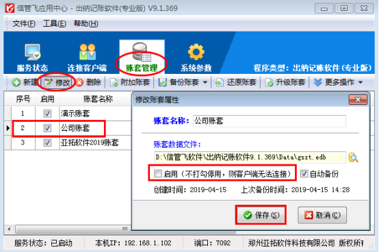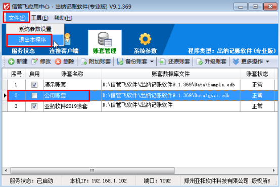 亞拓軟件旗下的信管飛RMS、信管飛倉庫管理軟件、信管飛送貨單軟件、信管飛出納記賬軟件、信管飛票據(jù)打印軟件等軟件程序安裝后會(huì)顯示兩個(gè)圖標(biāo),一個(gè)是應(yīng)用中心程序(紅色圖標(biāo)),一個(gè)是客戶端程序(藍(lán)色圖標(biāo))。這些軟件都含有賬套管理功能,在應(yīng)用中心里面可以建立多個(gè)賬套,已使用的帳套如果不再繼續(xù)使用,可以停用帳套,停用帳套后,客戶端程序登錄時(shí)無法連接該帳套。我們以信管飛出納記賬軟件專業(yè)版為例演示一下如何停用帳套。