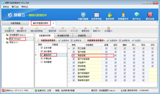 以“信管飛送貨單軟件”為例,示范下如何設(shè)置操作員不能新增商品信息。