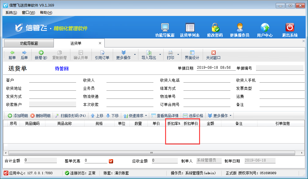 以送貨單軟件為例,新開送貨單界面默認顯示折扣率%和折扣單價數據項(如下圖所示),部分用戶在開單時不需要顯示折扣率%、折扣單價,會咨詢客服如何去掉這兩項。本文詳細介紹一下如何設置新開送貨單界面不顯示折扣率%和折扣單價?
