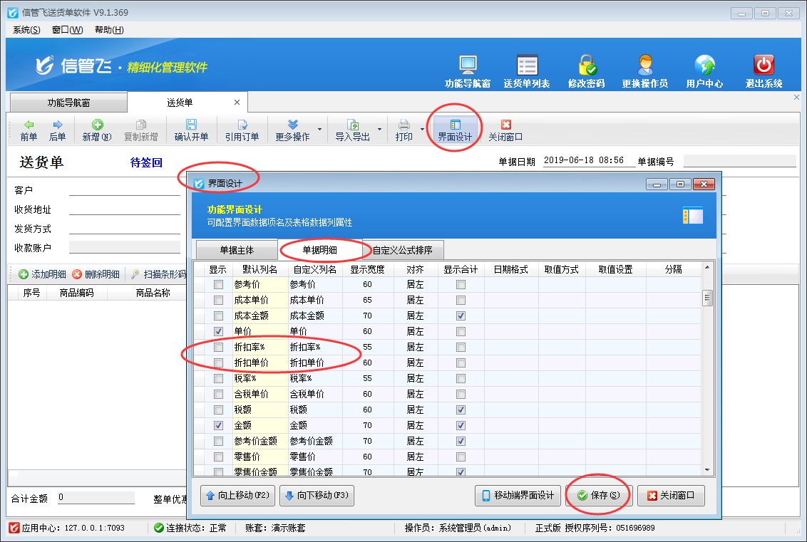 在送貨單界面工具欄點擊“界面設計”按鈕,打開界面設計窗口,選擇單據明細,找到“折扣率%”和“折扣單價”數據項,將“顯示”勾選取消并保存配置即可。