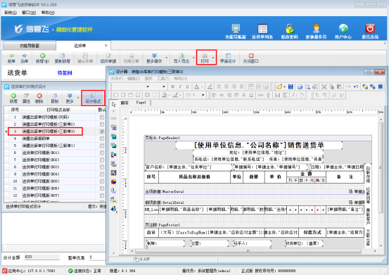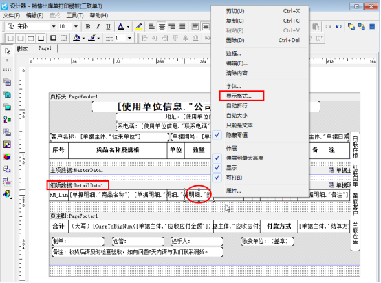 打開一個送貨單,點擊“打印”—》“打印格式設計”,在打印格式設計界面,選擇示例模板“銷售出庫單打印模版(三聯(lián)單3)”,點擊“設計格式”,進入模板設計器界面,如下圖所示: