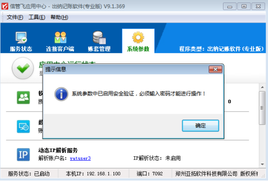 應(yīng)用中心的管理和配置會(huì)對(duì)軟件的運(yùn)行產(chǎn)生重大影響,因此軟件提供增強(qiáng)安全驗(yàn)證功能,啟用安全驗(yàn)證后執(zhí)行賬套管理、系統(tǒng)參數(shù)設(shè)置等功能時(shí)會(huì)要求輸入密碼,驗(yàn)證密碼通過(guò)后才可以進(jìn)行相應(yīng)操作。下面我們以信管飛出納記賬軟件應(yīng)用中心為例詳細(xì)介紹下如何啟用安全驗(yàn)證功能。