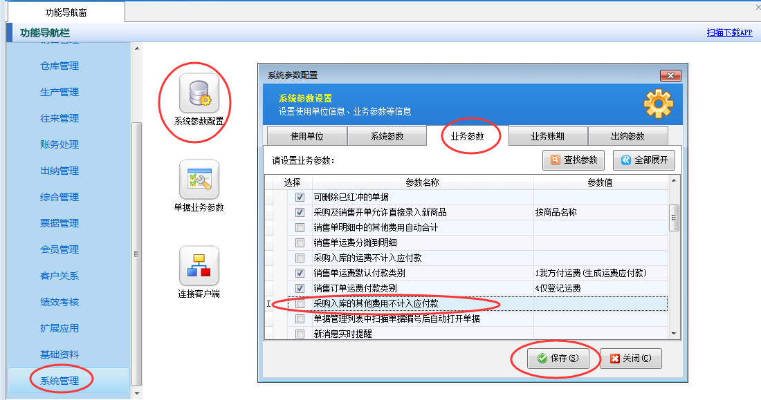 在功能導航窗點擊“系統管理”—》“系統參數配置”—》“業務參數”,即可進入到“業務參數”配置界面,在業務單據相關參數內將“采購入庫的運費不計入應付款”參數的勾選取消,設置完成后點擊“保存”按鈕保存配置,如下圖一所示。