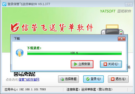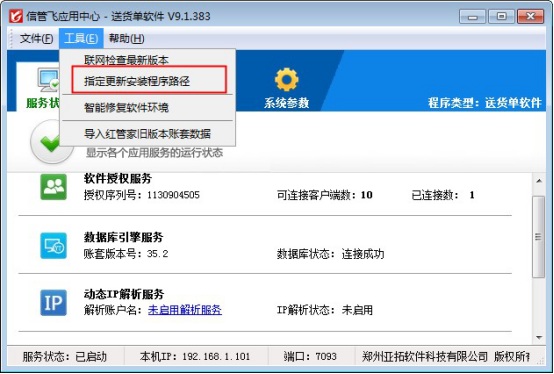 信管飛送貨單軟件、信管飛RMS軟件、信管飛倉庫管理軟件等都支持網絡版本(即可以多臺機器同時使用,數據共享,數據集中存儲在一臺機器上),軟件會不定期更新新版本,網絡版多臺電腦使用的時候,每次更新程序需要每臺電腦都下載最新版安裝程序進行安裝,非常麻煩。軟件支持在主機電腦的應用中心程序上指定更新安裝程序,便于客戶端登錄的時候如版本不一致會提示直接下載安裝程序。