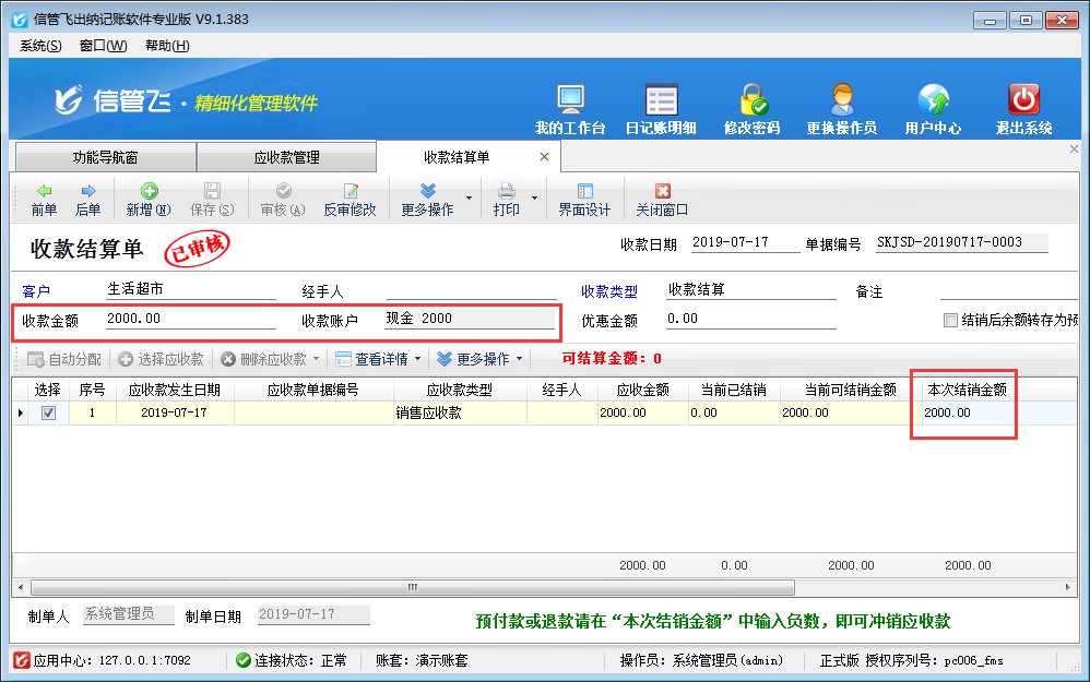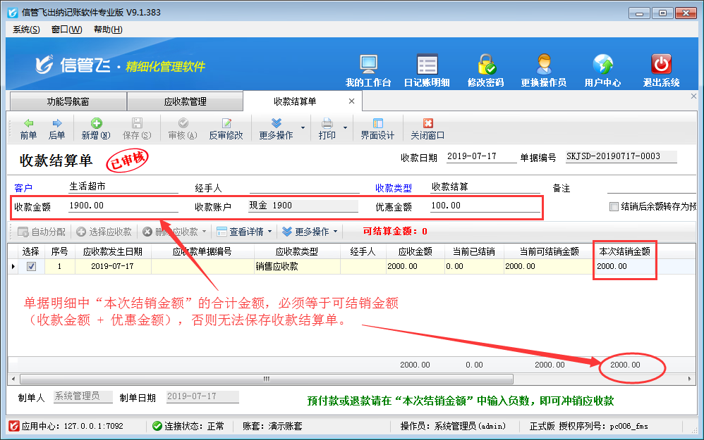 注意:收款結(jié)算單單據(jù)明細(xì)中“本次結(jié)銷金額”的合計(jì)金額,必須等于可結(jié)銷金額(收款金額 + 優(yōu)惠金額),否則無(wú)法保存收款結(jié)算單。