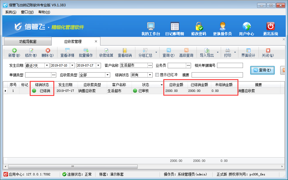 收款結(jié)算單單據(jù)審核之后,更新應(yīng)收款的結(jié)銷狀態(tài),在應(yīng)收款管理界面可以查看應(yīng)收款結(jié)銷情況,如下圖所示,客戶“生活超市”應(yīng)收金額2000元已結(jié)銷,未結(jié)銷金額為0。